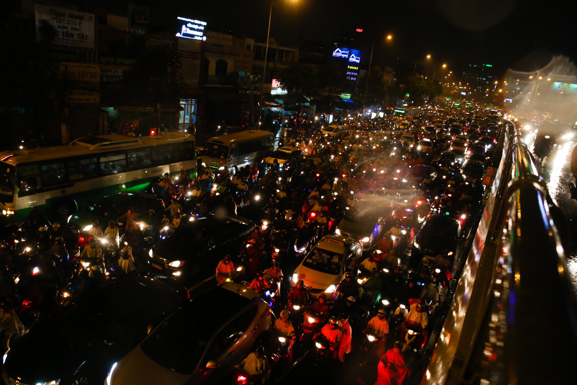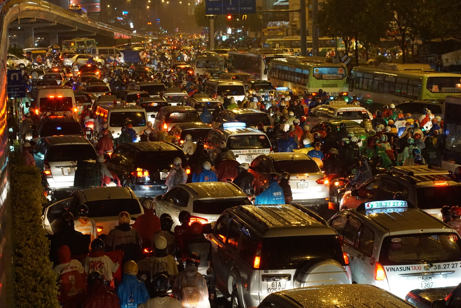 | Giao thông tê liệt hoàn toàn tại các tuyến từ cầu Sài Gòn vào trung tâm thành phố, Xô Viết Nghệ Tĩnh và ngã 4 Hàng Xanh. |