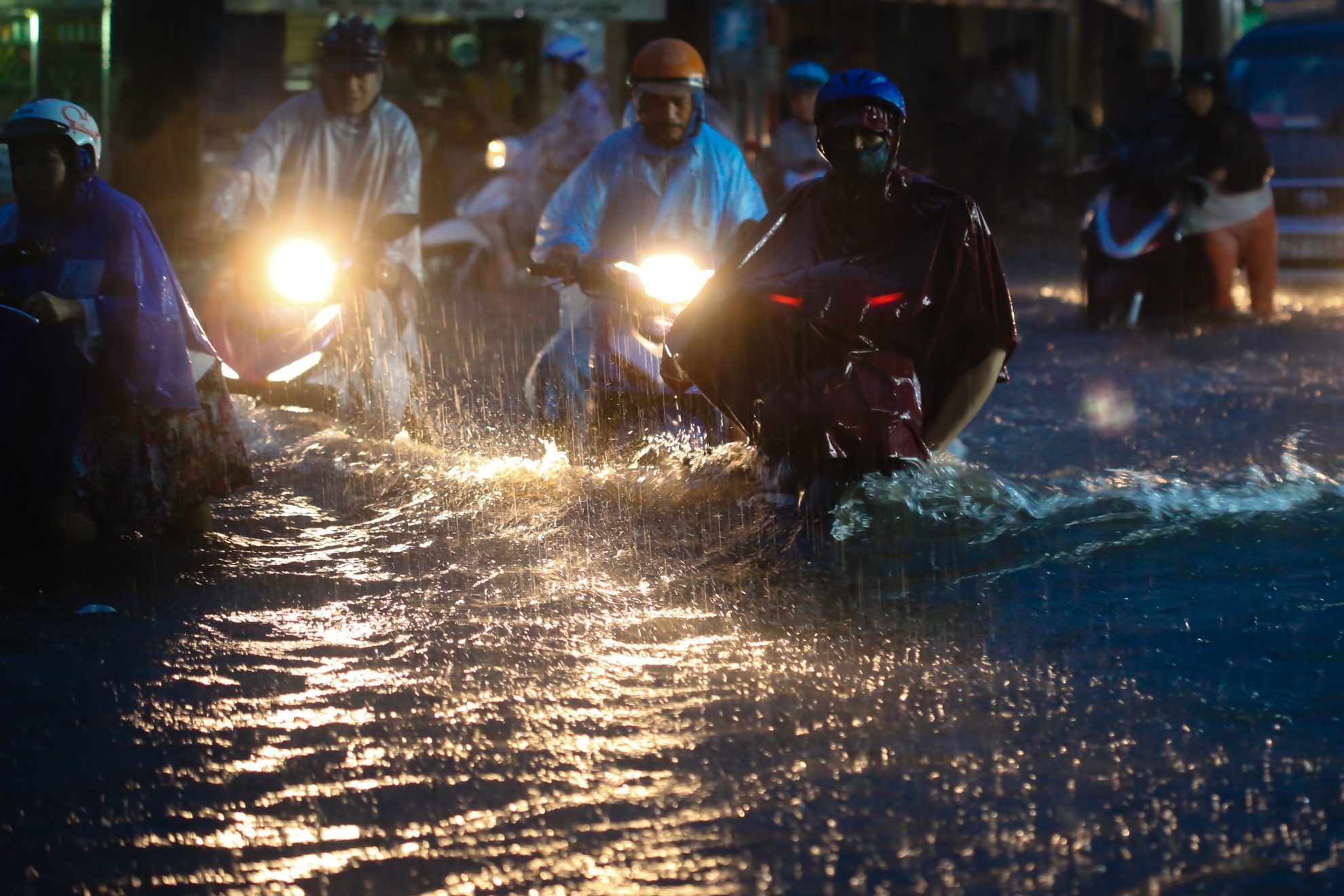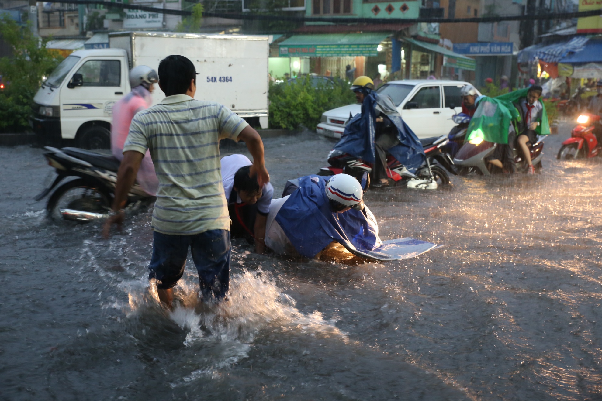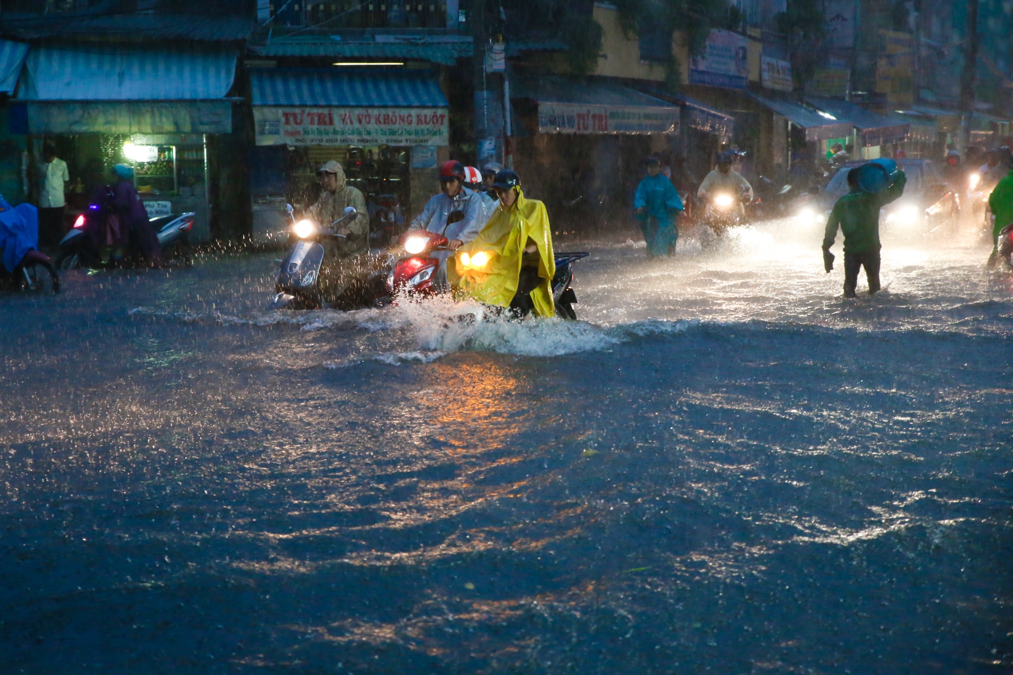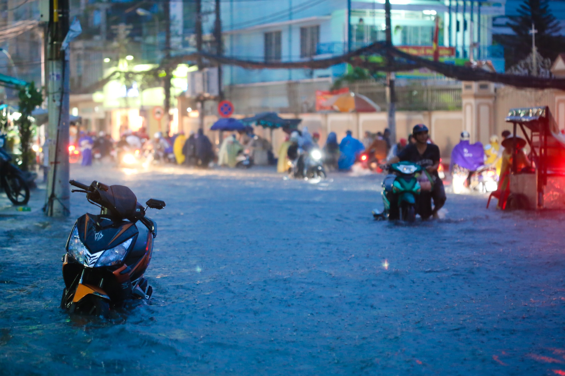 | Đường Bùi Hữu Nghĩa, Bình Thạnh, nước ngập hơn nửa bánh xe. |