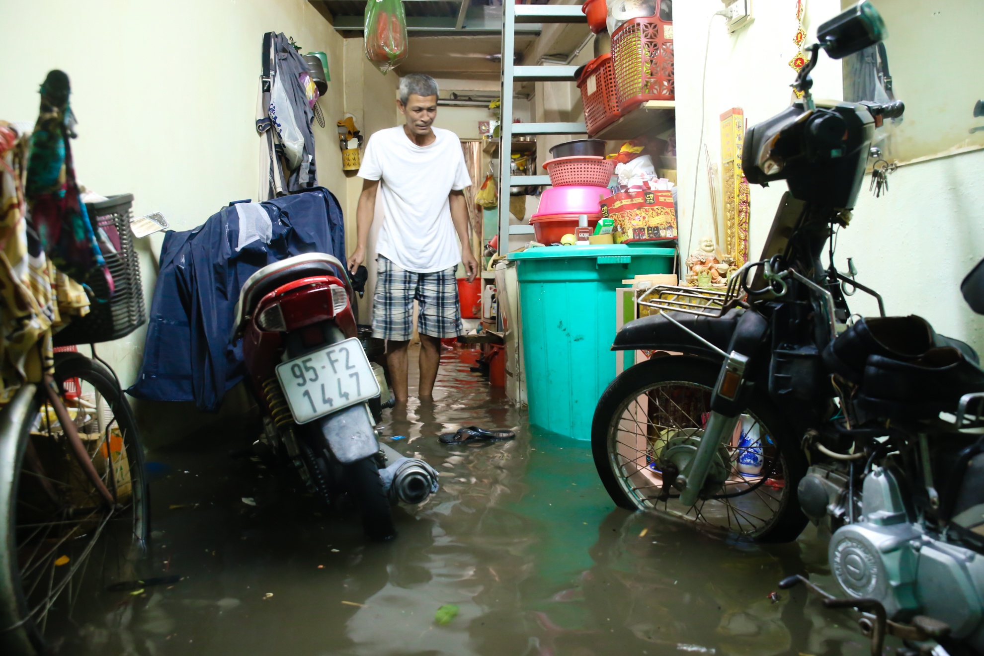 | Nhà ông Hải trong một con hẻm ở Điện Biên Phủ bị nước tràn vào cả bàn thờ. Ông cho biết đây là lần đầu tiên tuyến đường này bị ngập cao như vậy trong vài năm qua. |