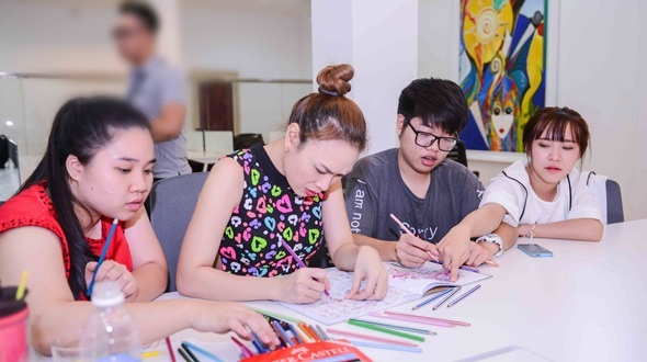 | Mỹ Tâm dành thời gian tô màu với học trò của mình. |