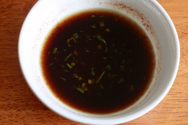 Kết hợp giấm, dầu ô liu và ngũ vị hương muối và hạt tiêu trong một bát trộn nhỏ.