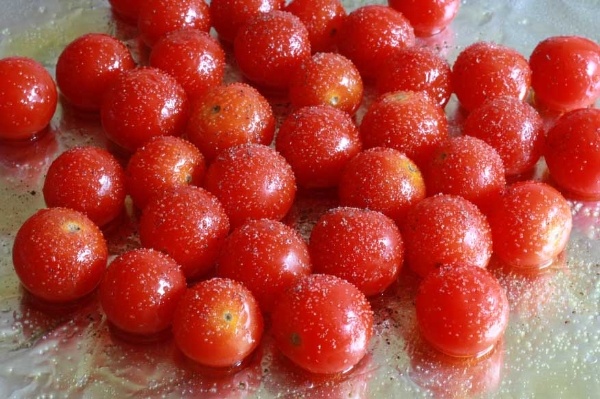 Cà chua bi rửa sạch, đặt lên khay nướng, rắc một chút muối và tiêu đều lên cà chua.