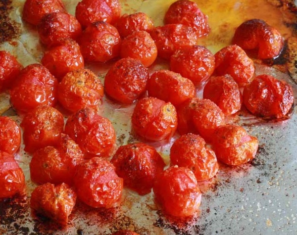 | Nướng cà chua trong lò khoảng 10-15 phút đến khi cà chua chín săn vỏ, hơi vỡ một chút như thế này. |