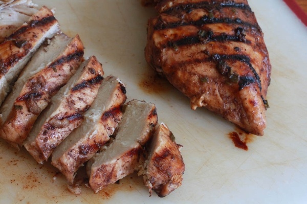 | Nướng gà đến khi gà chín, nhớ phết nước sốt đều đặn, thái nhỏ gà thành từng lát mỏng. |