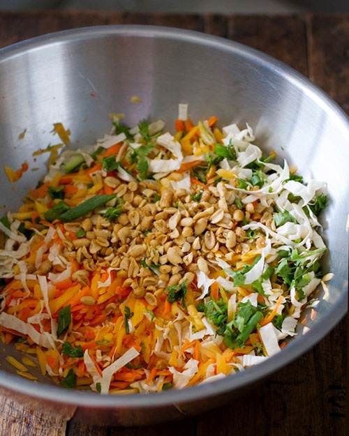 | Trộn nước sốt với rau và gà xé nhỏ. Thêm đậu phộng giã nhuyễn. |