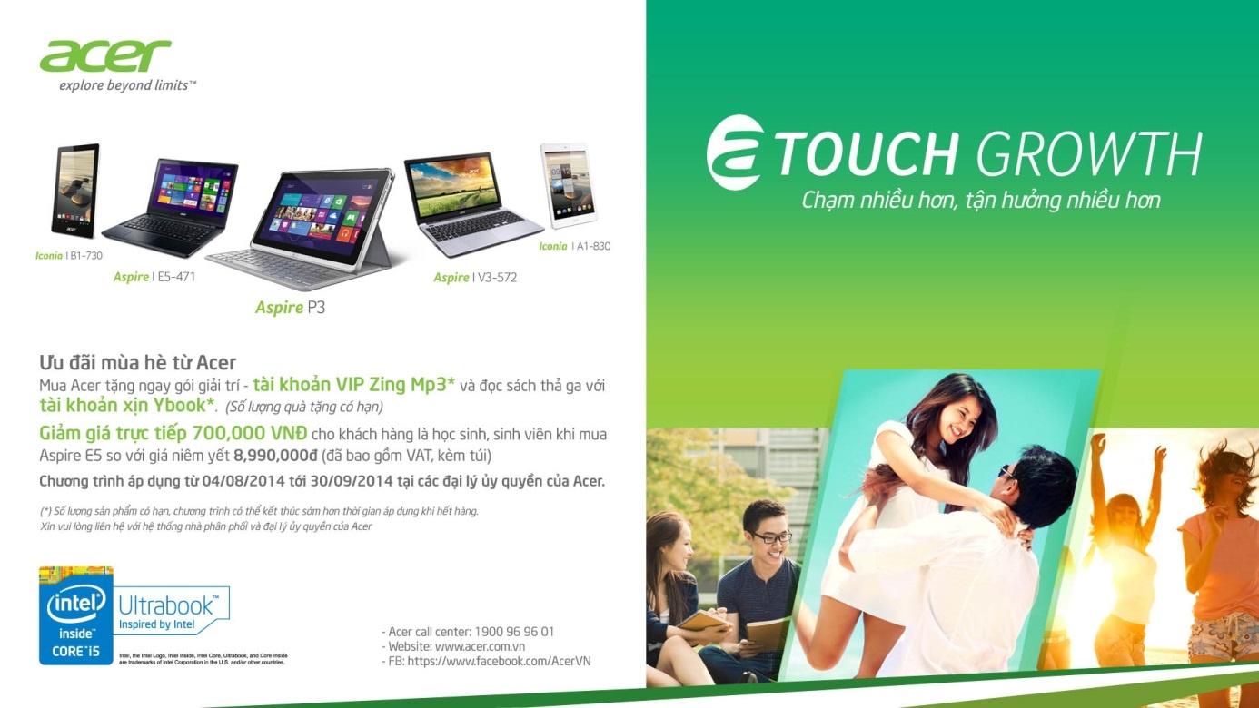 Trong mùa hè 2014, song song với các hoạt động tai đai lý, Acer còn mang đến cho khách hàng những ưu đãi đặc biệt để tối ưu hóa công nghệ khi mua các sản phẩm máy tính xách tay thuộc dòng Acer Aspire như E5-471, P3 hay V3-572 hoặc các sản phẩm máy tính bảng thuộc dòng Acer Iconia như B1-730 và A1-830. Theo đó, khi mua các sản phẩm trong chương trình, khách hàng sẽ có cơ hội sở hữu một trong 500 tài khoản VIP Zing để có thể trải nghiệm cuộc sống hiện đại với âm nhạc chất lượng cao hay hình ảnh chất lượng HD từ kho phim của Zing TV. Bạn sẽ hoàn toàn thoải mái tận hưởng những phút giây giải trí âm nhạc và phim ảnh miễn phí với đường truyền tốc độ cao và không bị làm phiền bởi những đoạn quảng cáo chèn trên thiết bị công nghệ hiện đại của Acer trong suốt 3 tháng kể từ khi kích hoạt tài khoản. Không chỉ vậy, những khách hàng có đam mê đọc sách sẽ cực kỳ thích thú với hơn 3000 đầu sách điện tử cho bạn lựa chọn khi sở hữu một trong 500 tài khoản YBOOK miễn phí trong 12 tháng kể từ ngày kích hoạt tài khoản trên thiết bị của Acer.