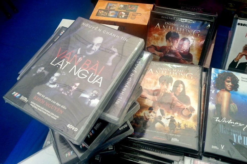 | DVD bộ phim Ván bài lật ngửa làm nên tên tuổi của nghệ sĩ Nguyễn Chánh Tín bỗng dưng hot trong hội sách năm nay. Ngay bên cạnh là DVD phim Dòng máu anh hùng - tác phẩm được Nguyễn Chánh Tính đầu tư thành công nhưng vì nạn "đĩa lậu" nên không thể thu hồi vốn. Theo Nguyễn Chánh Tính chia sẻ là từ đó, ông lâm vào cảnh nợ nần và bị ngân hàng "xiết" nhà. |