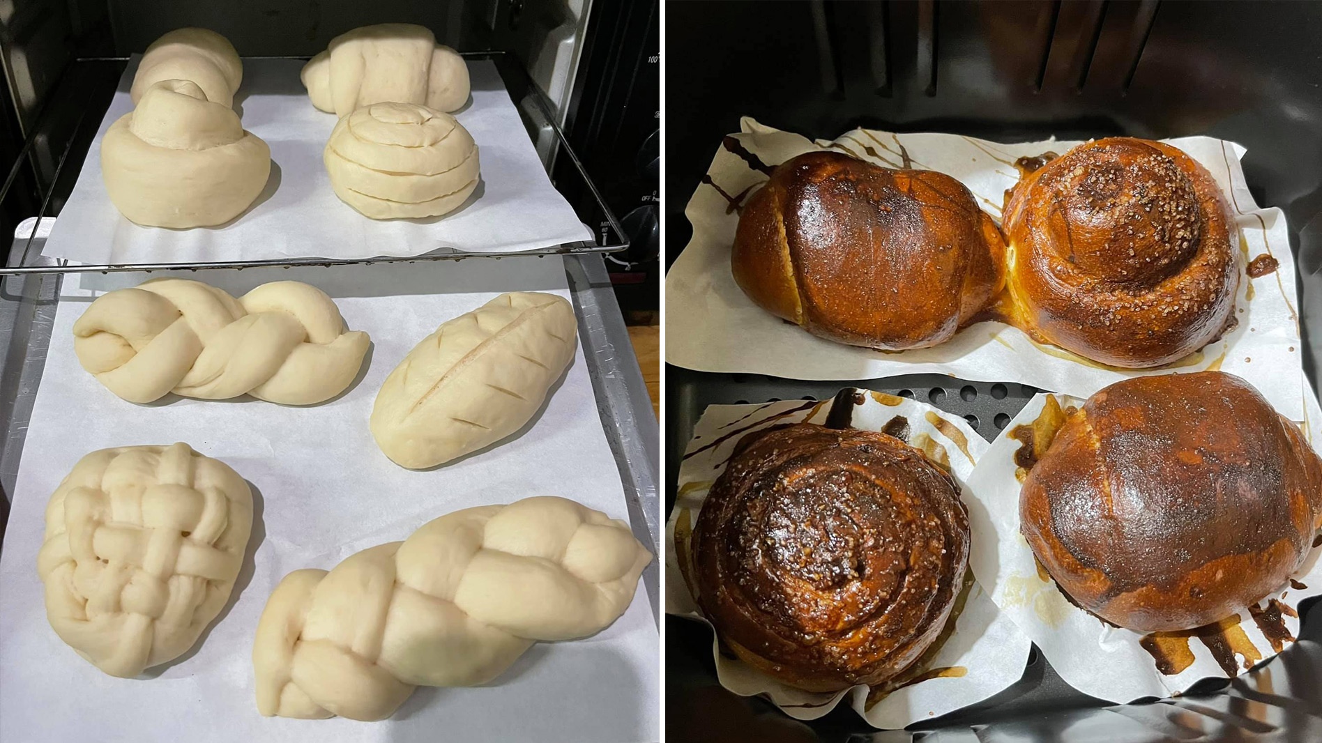 Xong khâu tạo hình, tôi cho 8 chiếc bánh vào lò nướng nhưng có vẻ hơi chật nên "hào phóng" để một nửa thử nghiệm ở nồi chiên không dầu. Vì nồi chiên có nhiệt độ ổn định và cao hơn lò nướng, tôi đặt nhiệt độ và thời gian khá thấp. Trong khi tôi hào hứng đợi chờ thì kết quả thu được là những ổ "bánh mì bóng đêm" không thể sử dụng.