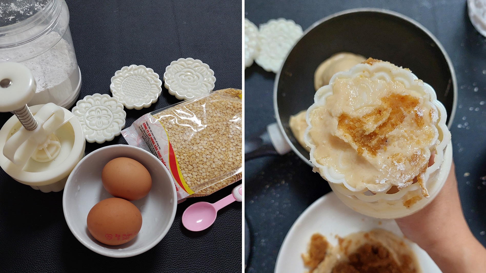 Tuy nhiên, đến khâu trộn bột làm bánh, tôi nhận ra có điều gì đó không đúng khi hỗn hợp vừa dính vừa vón cục. Tôi nhanh chóng sửa sai nhưng cứ thêm nước thì nhão, thêm bột thì hỗn hợp lại trở nên vón cục. Khi vỏ bánh khá dẻo, bọc được nhân bên trong, tôi cho vào khuôn và đè xuống thì phần trào ra phía dưới, phần dính bên trên.