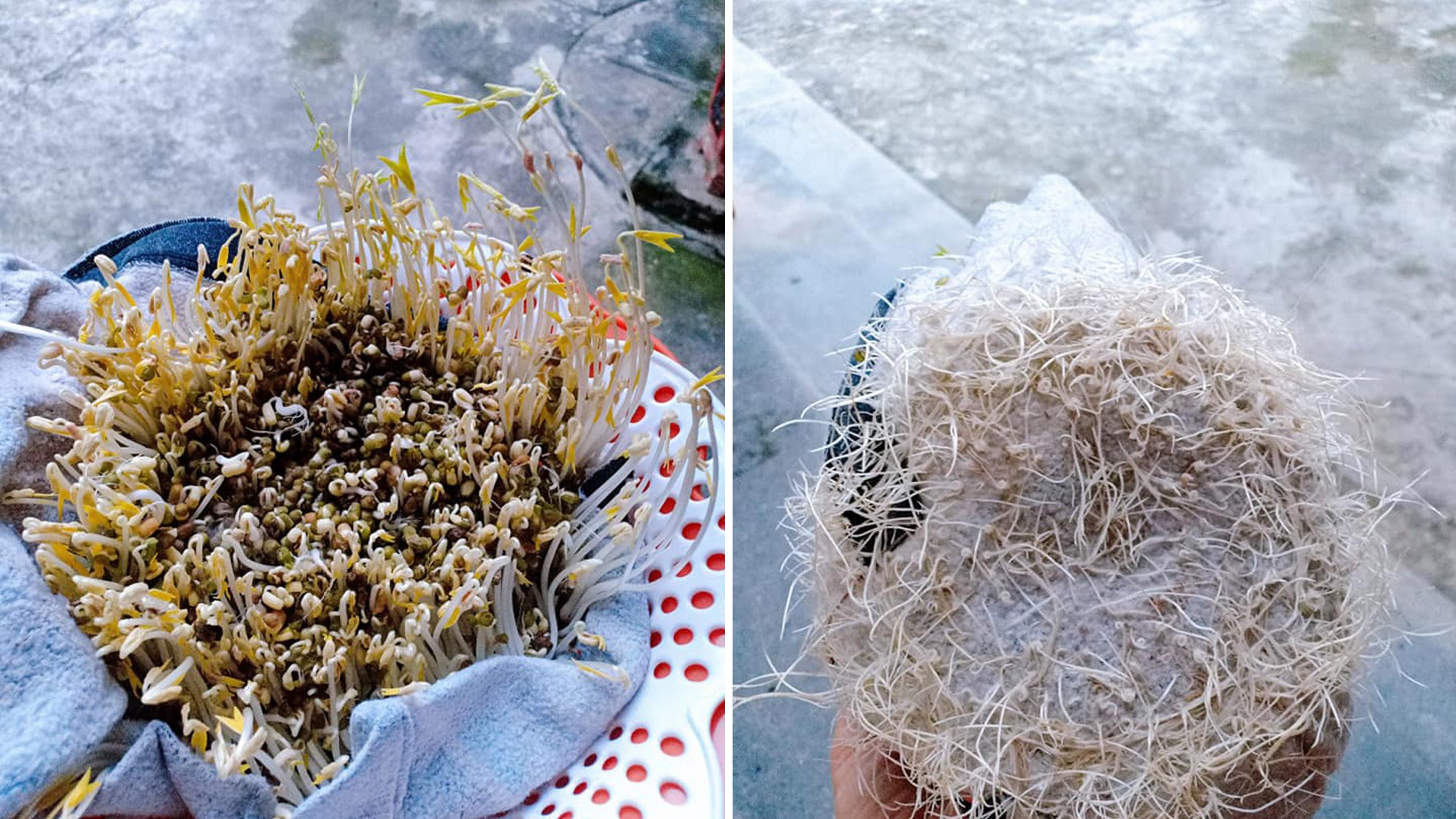 Kiểm tra thấy hạt đỗ nứt mầm trắng ra, tôi đem rửa lại với nước sạch và để ráo chừng 7-10 phút. Trong lúc đó, tôi dùng hai mảnh vải ngâm nước rồi vắt bớt, trải một mảnh vải lên chiếc rổ rồi lấy đỗ rải lên, mảnh còn lại dùng để đậy. Sau đó, tôi sử dụng vật nặng 5 kg đè lên rồi đem cất rổ trong gầm cầu thang 3 ngày.