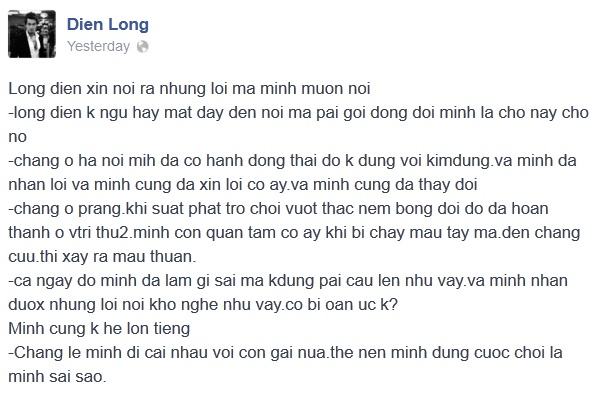 Trước những ồn ào, mới đây, Long Điền đã chính thức lên tiếng về vụ việc. Anh chia sẻ trên trang mạng xã hội cá nhân:"Long Điền xin nói ra những lời mà mình muốn nói: