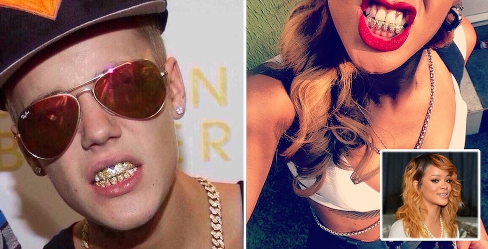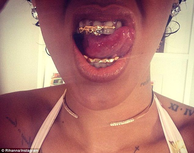 | Rihanna có lẽ là tín đồ của trò sắm phụ kiện vàng cho răng. |