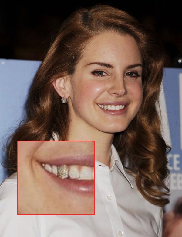 | Cô ca sĩ Lana Del Rey với chiếc răng nanh đính vàng. |