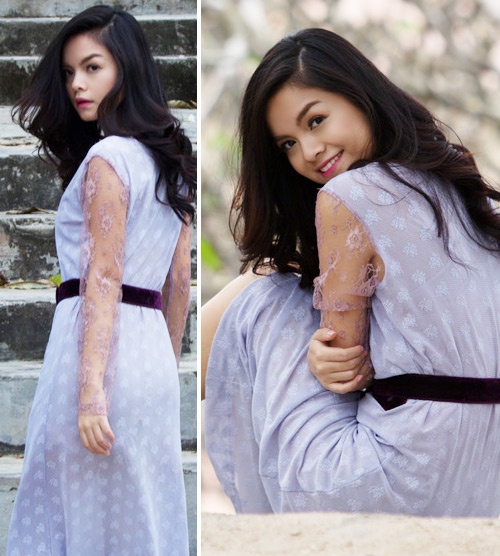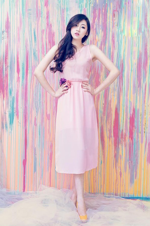 | Tông hồng phớt rất hợp với nước da nâu của Ngọc Hân. |