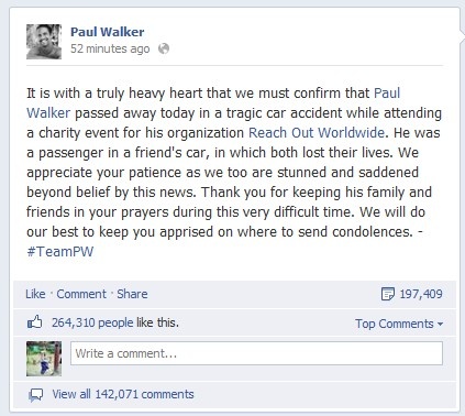 Ê-kip của nam diễn viên Paul Walker cũng đưa thông cáo: "Chúng tôi vô cùng thương tiếc báo tin Paul Walker đã qua đời sau một tai nạn ô tô, khi đang trên đường tới sự kiện từ thiện của tổ chức Reach Out Worldwide. Bạn của Paul cầm lái, cả hai cùng thiệt mạng trong vụ tai nạn này. Chúng tôi thật sự rất đau buồn trước sự ra đi này. Cám ơn những lời chia sẻ và cầu nguyện đến gia đình và bạn bè của Paul. "