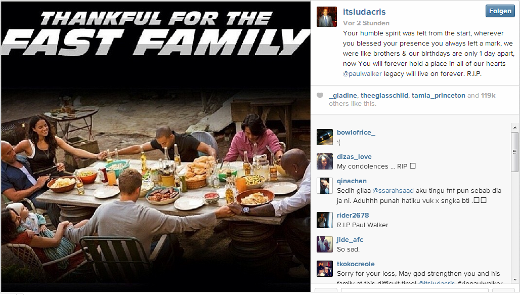 | Rapper kiêm diễn viên da màu Ludacris là người sát cánh bên Paul từ những phần đầu tiên của loạt phim Fast and Furious cũng chia sẻ trên trang Twitter của mình cũng như Instagram hình ảnh dàn diễn viên cùng nhau cầu nguyện trong bộ phim Fast Six. |