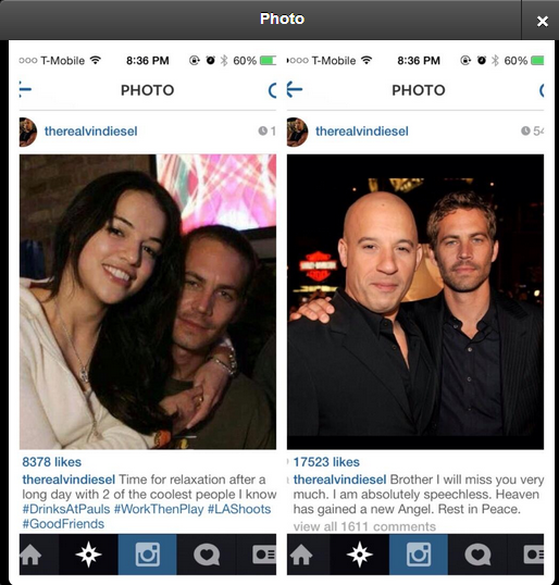 | Nam diễn viên chính Vin Diesel sau khi biết tin đã đăng lại những hình ảnh thân thiết giữa anh và Paul khi cả 2 cùng tham gia bộ phim Fast and Furious. |