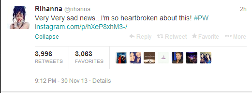 | Ngay khi nghe tin Paul Walker tử nạn, trái tim nữ ca sĩ Rihanna như tan vỡ. |