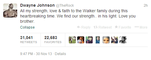 | Dwayne Johnson ngôi sao cùng sát cánh với Paul Walker trong Fast Five và Six chia sẻ về cái chết của người đồng nghiệp: "Mọi sức mạnh, tình yêu và niềm tin tôi xin gứi tới gia đình Walker trong khoảng thời gian đau đớn này. Chúng ta tìm thấy sức mạnh trong ánh sáng mà cậu ấy mang lại. Gửi người anh em" |