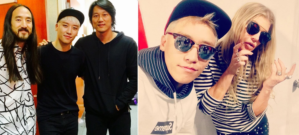 | Seung Ri chụp ảnh cùng Sung Kang (áo đen ảnh trái) và Fergie (giọng ca chính của The Black Eyed Peas). |