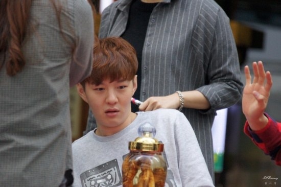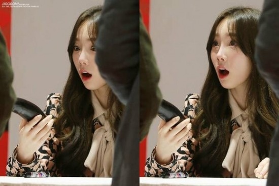 | Việc tặng quà cho thần tượng không còn là điều quá xa lạ, đặc biệt tại Hàn Quốc, các fansite và cá nhân thường xuyên được tiếp xúc và tặng quà thần tượng trong các buổi kí tặng sản phẩm mới, những lần gặp gỡ tại sân bay. Trưởng nhóm SNSD, Taeyeon há hốc mồm khi được fan tặng cho một quả cà tím. |