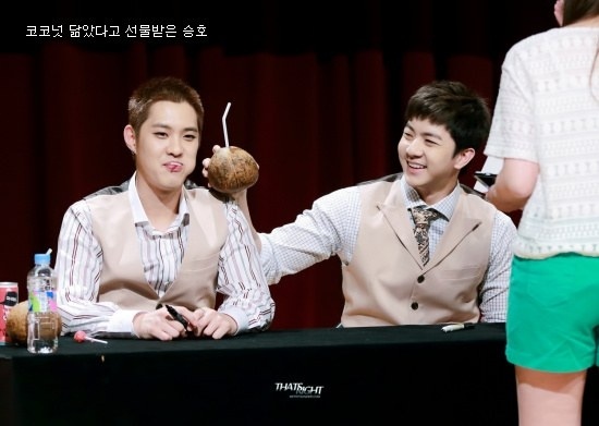 | Hoa quả đẹp da mà bổ dưỡng, Seungho được tặng nguyên trái dừa. |