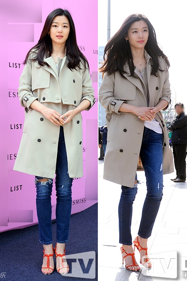 | Jeon Ji Hyun trẻ trung và không kém phần sành điệu với jeans rách gối, áo choàng kết hợp sandal cao gót đỏ nổi bật. |