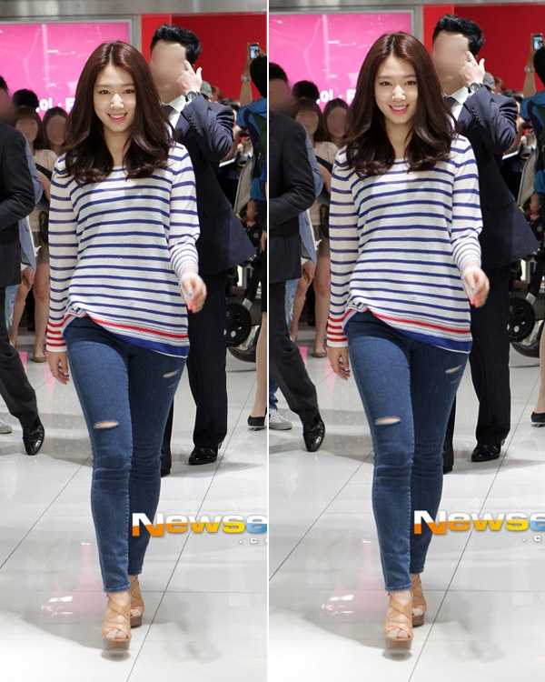 | Park Shin Hye xinh tươi dù chỉ diện áo thun kẻ ngang phối cùng jeans rách và sandal. |