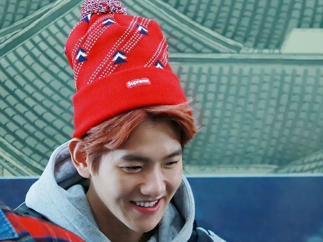 | Beakhyun (EXO) nổi bật với chiếc mũ beanie tone đỏ điểm xuyết một số họa tiết đáng yêu. |
