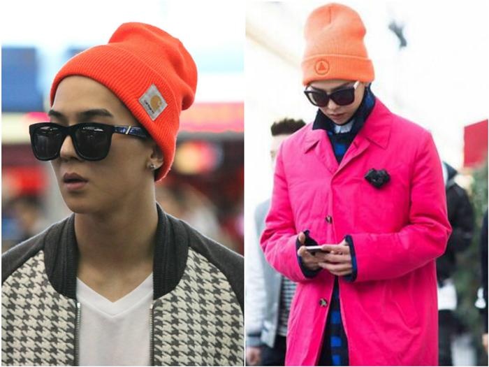 | 2 chàng rapper nhà YG, Minho và GD nổi bật ở sân bay khi diện mũ len tone cam với logo đơn giản.