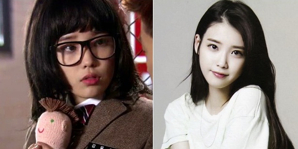 | IU trong Dream High: Nữ ca sĩ có gương mặt đẹp tự nhiên, trong sáng nên các chuyên gia hóa trang rất mất công để biến IU thành cô nàng ngốc nghếch trong Dream High. Ngoài tóc giả, đeo kính, IU còn phải mặc bộ đồ fat suit để tăng kích cỡ cơ thể. |