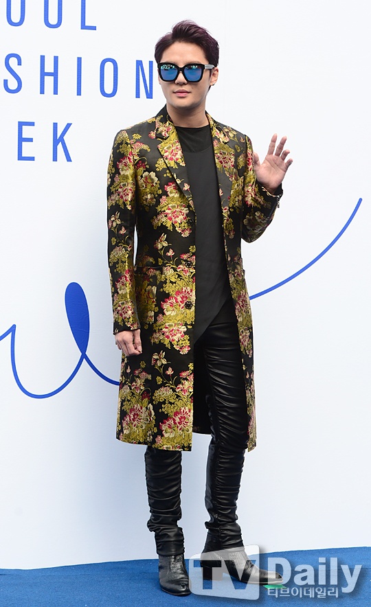| Junsu có phần hơi màu mè và sến sẩm với chiếc áo khoác hoa kết hợp cùng quần da. |