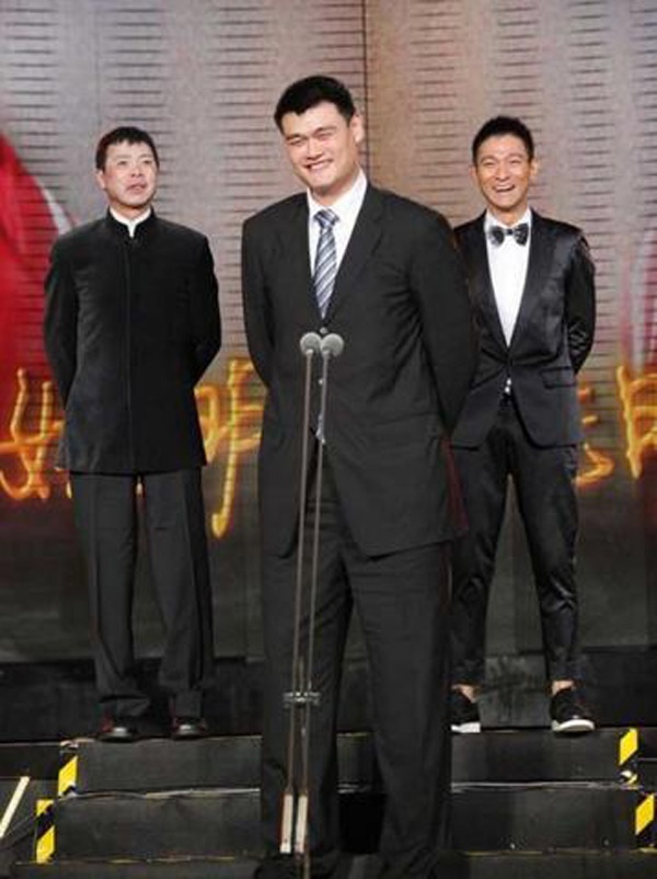 | Mặc dù đã đứng trên bục nhưng Lưu Đức Hoa và đạo diễn Phùng Tiểu Cương vẫn không thể cao bằng Diêu Minh. |