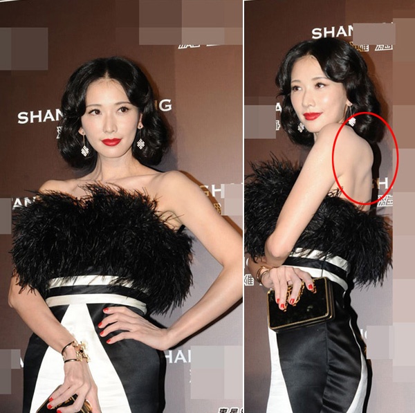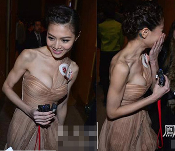 | Với bộ váy khoét rộng sâu ngực, Angela Baby lộ điểm yếu của phần ngực gầy gò. |