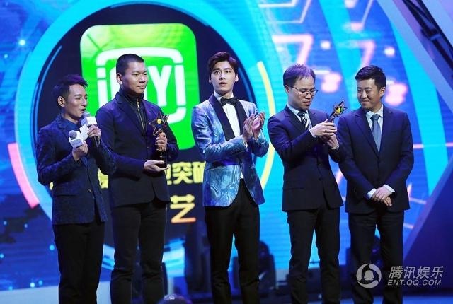 | Lý Dịch Phong (giữa) mặc vest xanh bóng lịch lãm. |