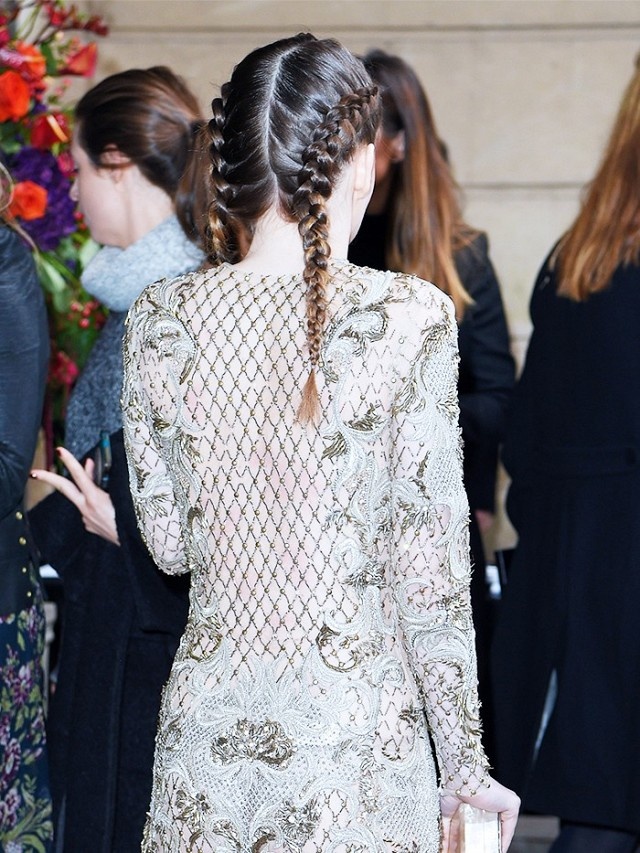 xuất hiện rạng rỡ tại tuần lễ thời trang với kiểu tóc bím đôi được tết từ đỉnh, còn được gọi là tóc tết boxer. |