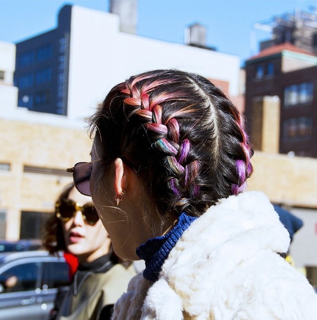 tạo màu sắc cầu vồng cho tóc tết đôi. |
