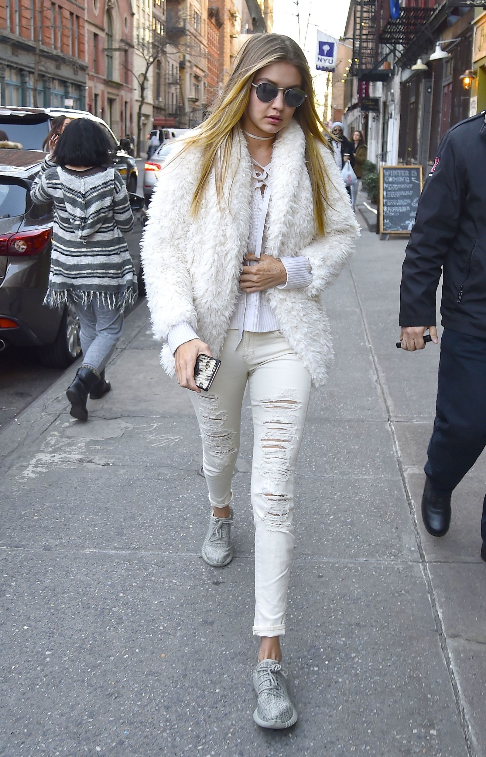 Gigi Hadid gợi ý cách mix quần jeans trắng trẻ trung với sneakers và áo lông trắng. |