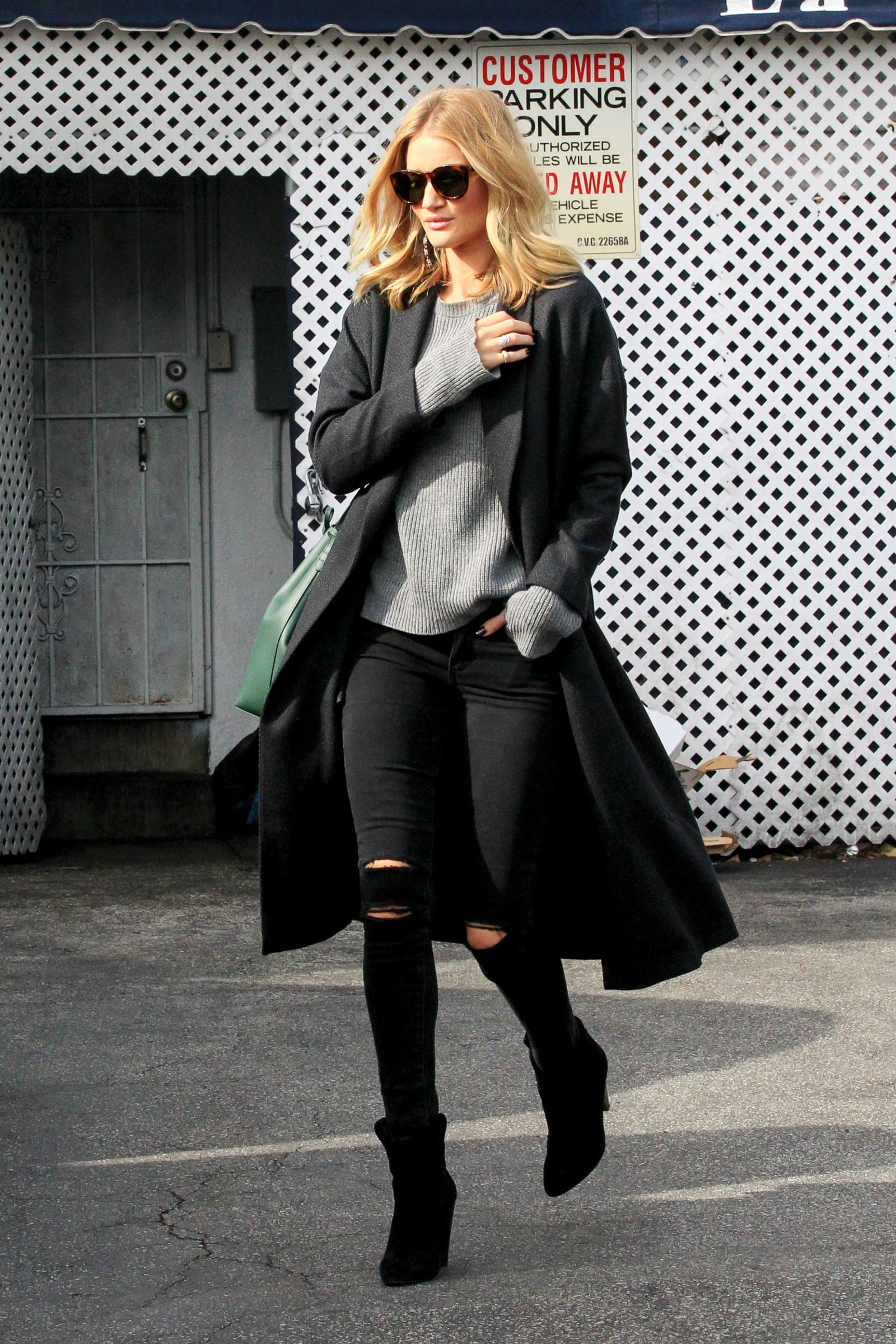 Rosie Huntington-Whiteley khoe vẻ sang trọng với mốt quần jeans đen xé gối. |