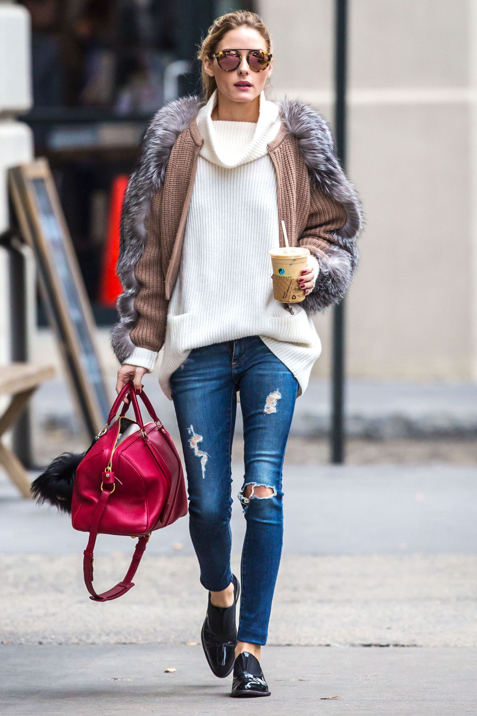 Olivia Palermo chọn jeans rách và loafer năng động khi xuống phố. |