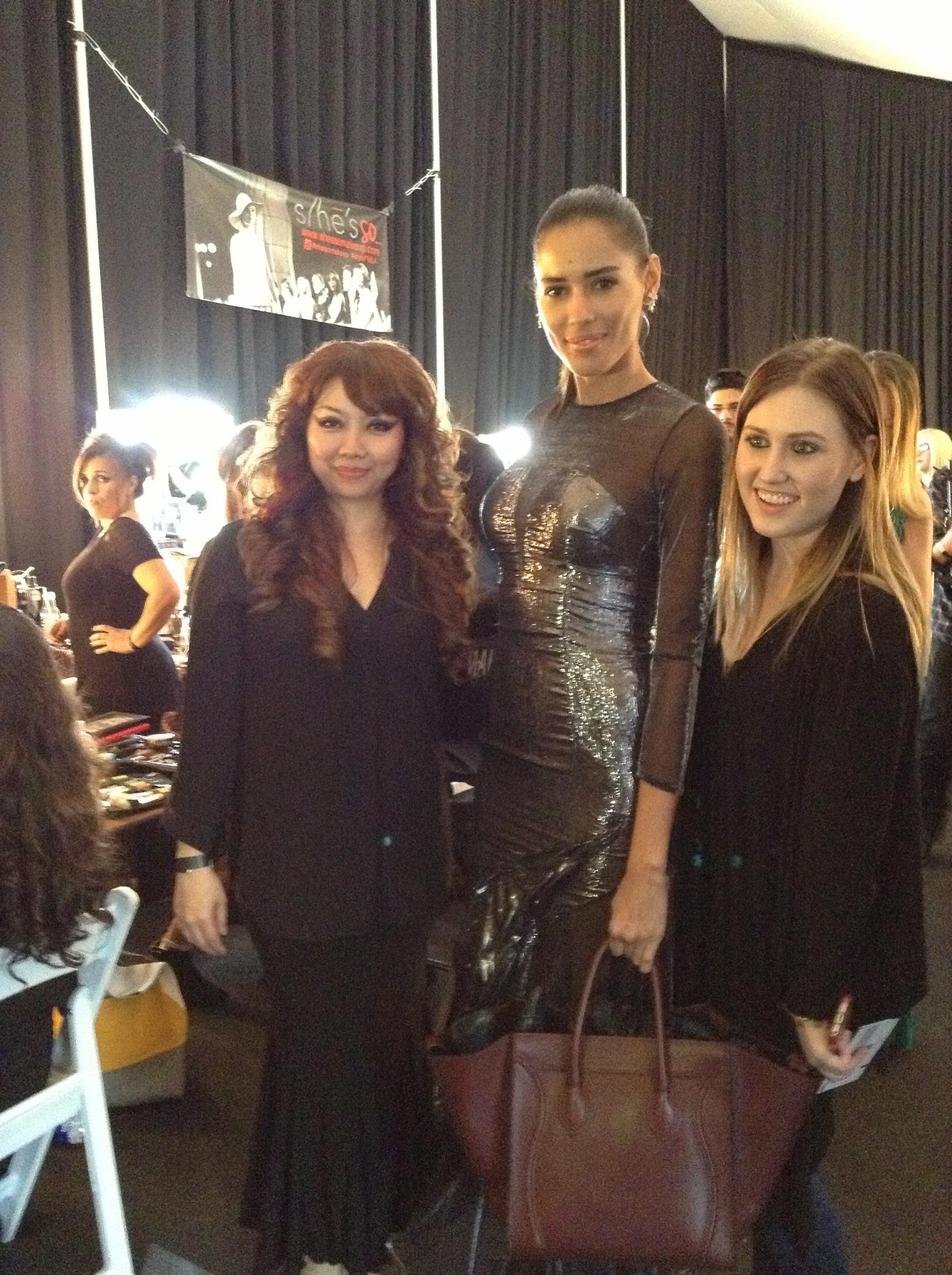 | Rebecca Da Costa (giữa) chúc mừng Quỳnh Paris ở hậu trường show diễn. |