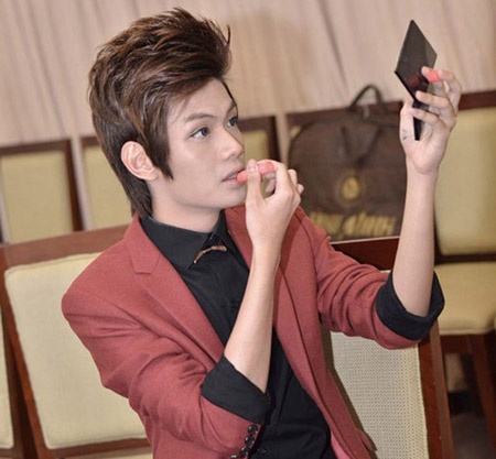 | Nam ca sĩ Long Nhật hài lòng với hình ảnh chỉn chu, được trang điểm kỹ lưỡng và không quên tô điểm môi bằng son hồng cùng lớp son bóng. |