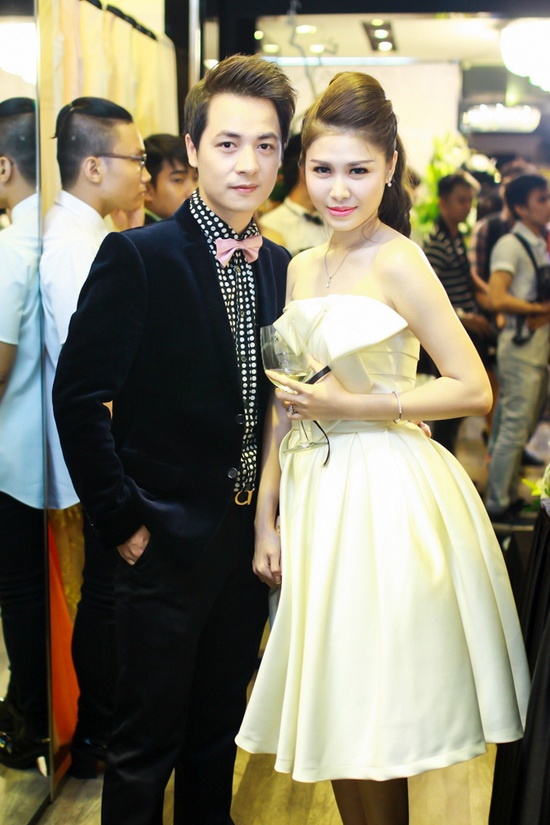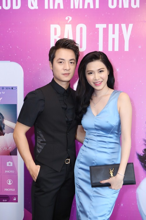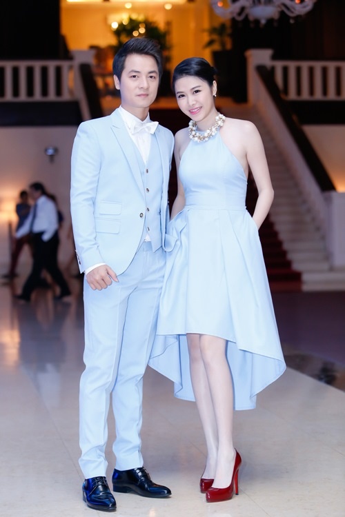 | Một dịp khác, ông bố một con khá bảnh bao trong set trang phục sơ-mi ngắn tay, áo ghi-lê hợp mốt, đồng bộ về gam màu đen. Anh tự tin sánh đôi cùng vợ tại một sự kiện phía Nam. Cựu hot girl khá nổi bật bên chồng khi diện bộ váy ôm dáng tông màu xanh nước biển. |