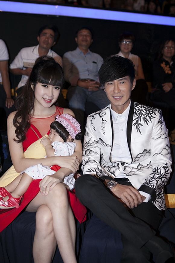 | Nam ca sĩ Trọn đời bên em sành điệu trong mẫu áo vest in họa tiết lá tre, còn bà mẹ hai con quyến rũ với đầm màu đỏ bắt mắt. Con gái Cherry duyên dáng không kém với váy chấm bi nữ tính. |