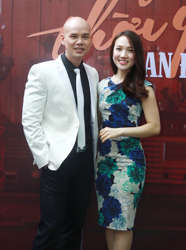 | Trong ngày ra mắt album của chồng, nam ca sĩ Ngôi sao lẻ loi sang trọng với áo vest trắng quần xanh, Ngọc Bích nhã nhặn với bộ đầm ôm tông màu xanh, họa tiết hoa mùa hè nổi bật. |