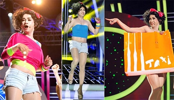 | Bắt chước Thu Minh thể hiện ca khúc Taxi trên sân khấu, Minh Thuận thậm chí không ngại khoe thân và liên tục cởi đồ hệt như phiên bản gốc. |