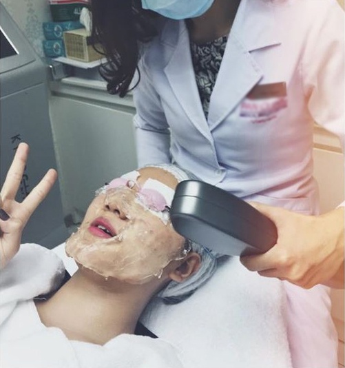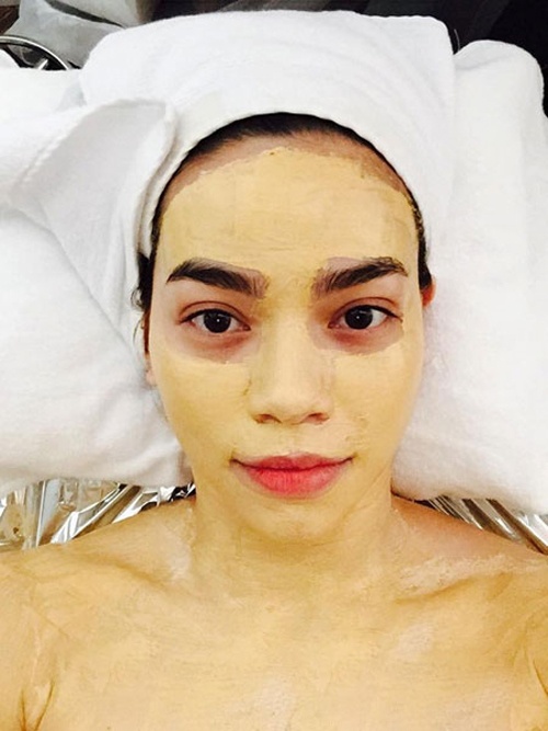 | Hà Hồ chọn liệu pháp chăm sóc da rất đắt giá là đắp mặt nạ vàng. Cô không chỉ chăm sóc vùng da mặt mà cổ, ngực... cũng được đắp mặt nạ cẩn thận. |