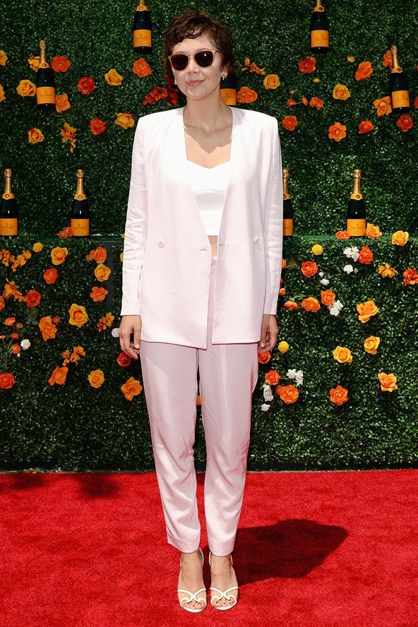 Diễn viên Maggie Gyllenhaal sang trọng với bộ suit màu hồng.