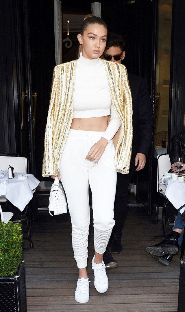 4. Sneaker trắng - Gigi Hadid: Đây là kiểu giày rất được lòng siêu mẫu 20 tuổi. Cô thường kết hợp nó với áo thun, chân váy và áo choàng vai. |
