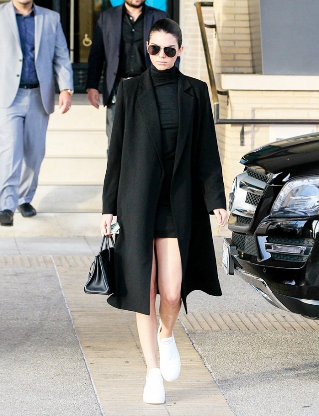 Kendall Jenner sành điệu khi mix váy len cao cổ bó sát với áo khoác dạ dài đen, giày thể thao màu trắng. |